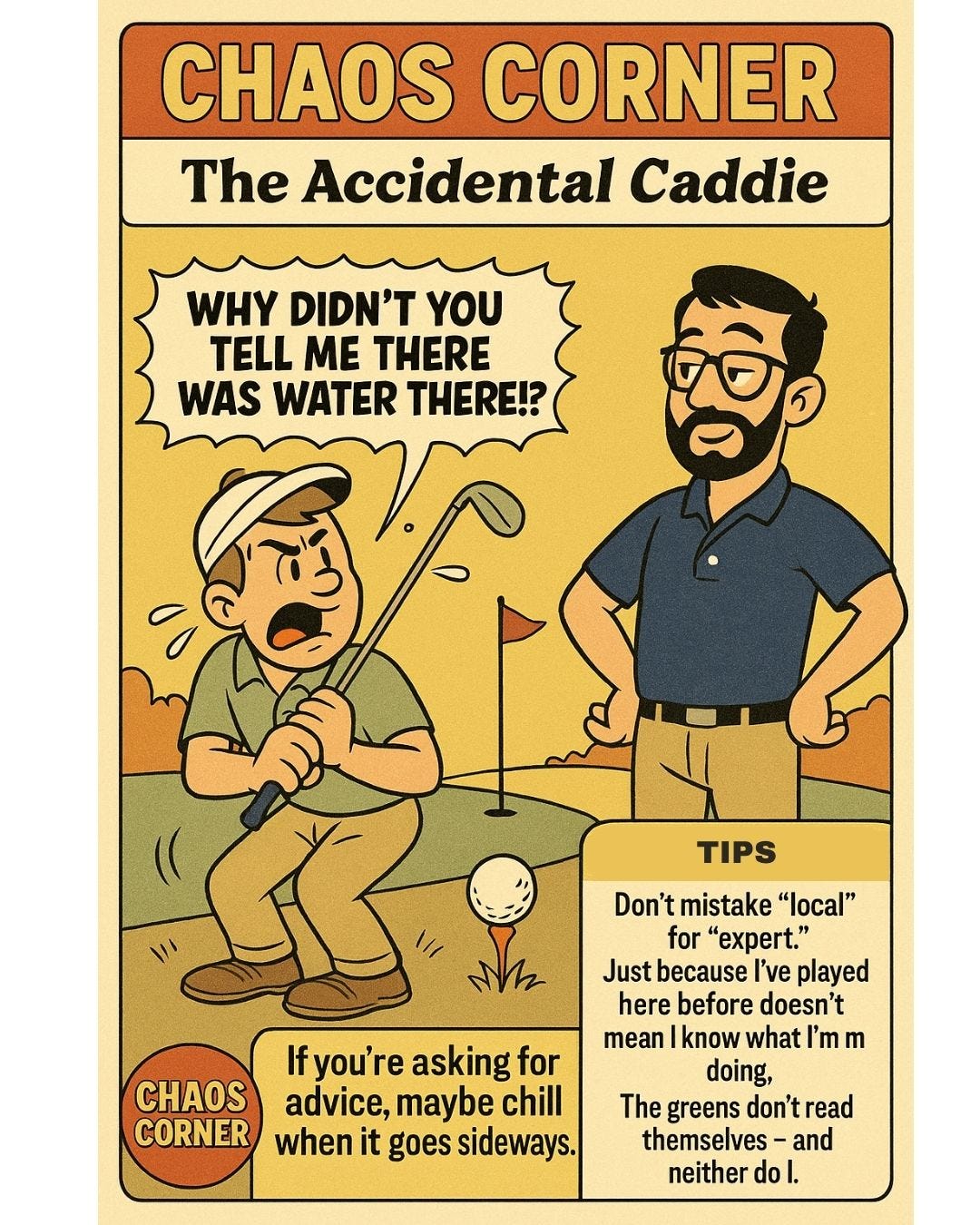 No big deal… until the guy turns out to be a first-time visitor who immediately clocks you as the local. Suddenly, you’re the unofficial course historian, swing coach, and part-time therapist.